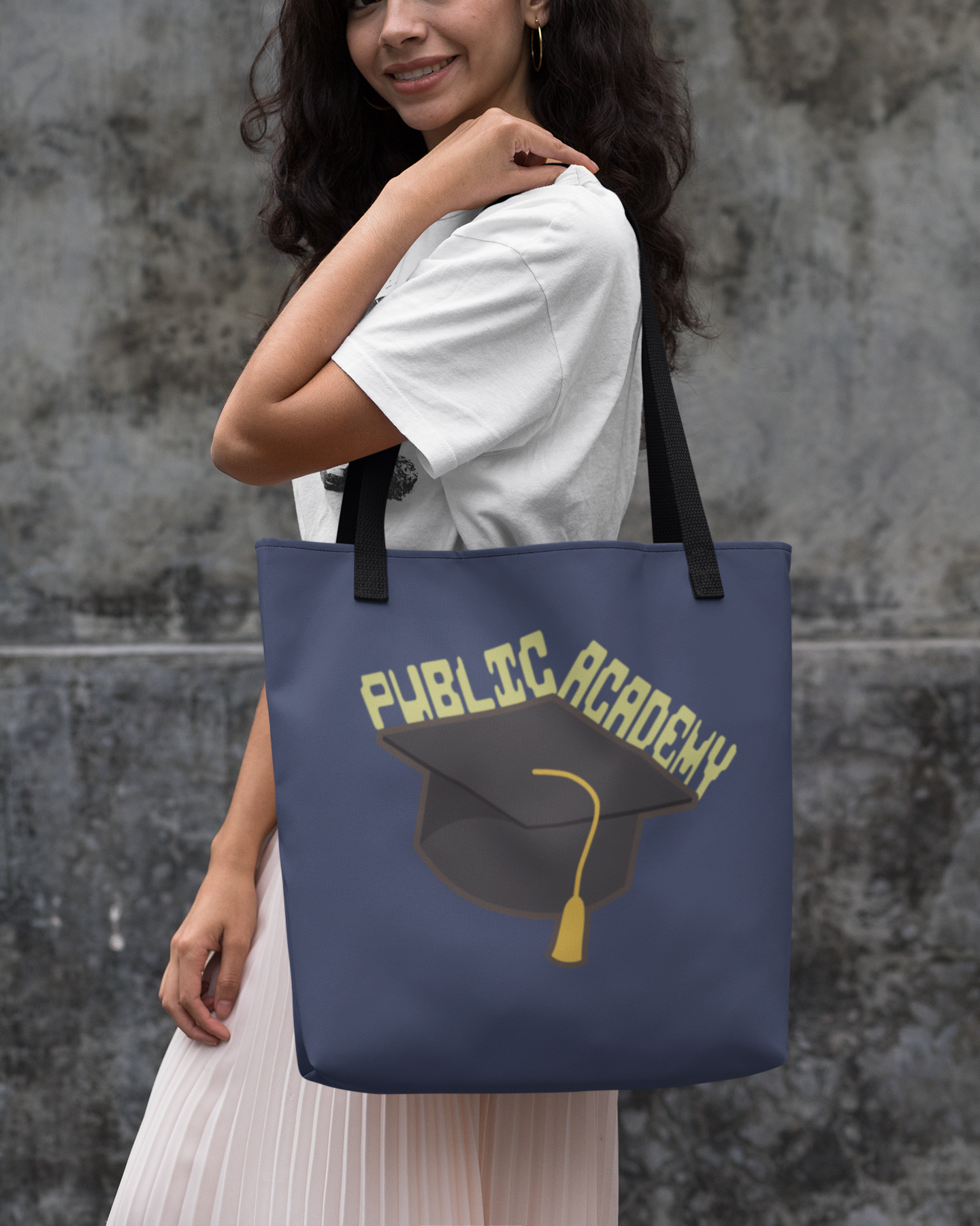 This tote isn’t just for carrying books, snacks, or your big ideas—it’s for repping the grind that got you here. With a bold graduation cap graphic and the iconic “Public Academy” text, it’s equal parts irony, pride, and power move.